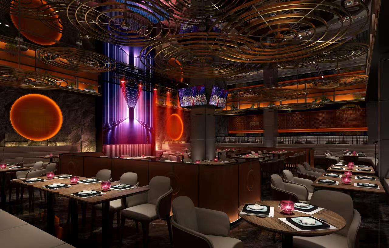 設(shè)計(jì)師精妙的利用落在大廳之中的承重柱為起點(diǎn),整齊有序的劃分出內(nèi)中外三個(gè)區(qū)域,同時(shí)三個(gè)區(qū)域之間用半身高的建材做了半包分隔,這樣既使得三個(gè)區(qū)域之間有了物理間隔,又可以讓三個(gè)區(qū)域共享整個(gè)大廳的視野,得到感官上的開闊感。另外,設(shè)計(jì)師在該承重柱上布置四塊屏幕,將其一下子提升為整個(gè)大廳的聚焦點(diǎn),讓周圍有序排列的桌椅有了眾星拱月的設(shè)計(jì)感,進(jìn)而將原本突兀的承重柱徹底化作大廳設(shè)計(jì)的一部分。四周墻面采用立體浮雕磚面,配合園林景觀中特有的圓形窗臺、溫暖微醺的橘黃燈效,讓消費(fèi)者全方面感受到寧靜平和之感。不僅于此,設(shè)計(jì)師還在桌面上放置了玫紅色的亮色燈盞,燈盞發(fā)出的亮色光暈和周遭相對昏暗的橘黃色光線對比形成一個(gè)專屬于消費(fèi)者自身的空間,這種利用燈光光效差在面積有限的大廳來營造空間隔斷的設(shè)計(jì),著實(shí)不凡。而其頂上錯(cuò)落布置的銅色類蚊香圓吊飾和如云似水的晶瑩刻像,則進(jìn)一步融入了中式設(shè)計(jì)的特色元素,提升了大廳的整體設(shè)計(jì)韻味。而作為餐吧主體之一的吧臺,設(shè)計(jì)師則采用了大片透明玻璃作為和其他區(qū)域的間隔,然后以密集的暖黃燈效作為烘托,將吧臺清晰明了地呈現(xiàn)在消費(fèi)者的視野中。