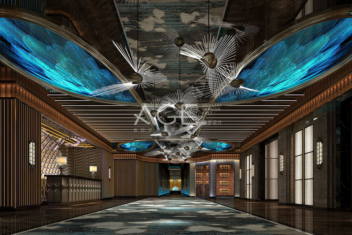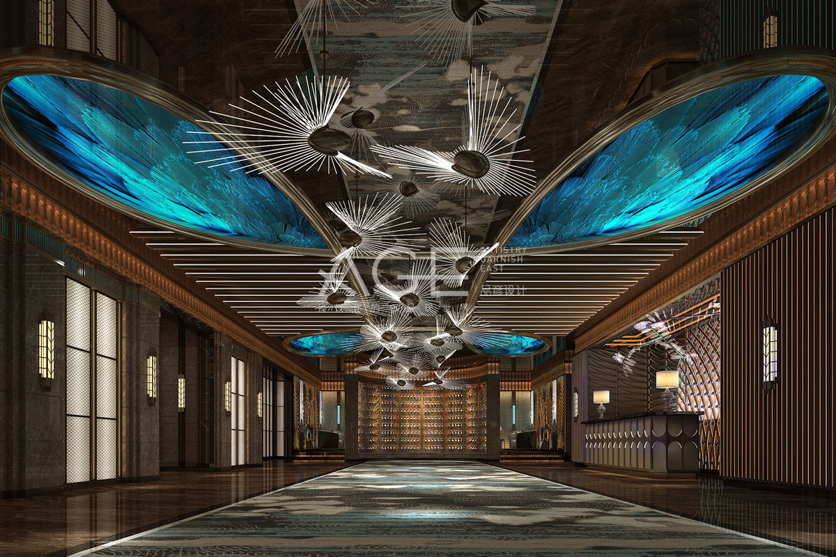 大堂,整體主色調(diào)方面帶有孔雀藍(lán)的夢(mèng)幻,讓人感覺出一種神秘的優(yōu)雅,吊燈整體效果宛如一只張開的蝴蝶環(huán)繞出的燈光,盡情地飛翔在深邃的銀河之中,充斥著令人向往的神話故事。優(yōu)雅與神秘相碰撞,定能帶來別樣的體驗(yàn)。不同燈效的設(shè)計(jì)襯托出輕奢的高貴,大堂角度1燈效以孔雀藍(lán)為基調(diào),輔助金色與灰白,帶給人的是高貴又神秘的優(yōu)雅。大堂角度2燈效以金色為基調(diào),孔雀藍(lán)為點(diǎn)綴,烘托出神秘的輕奢氣息。