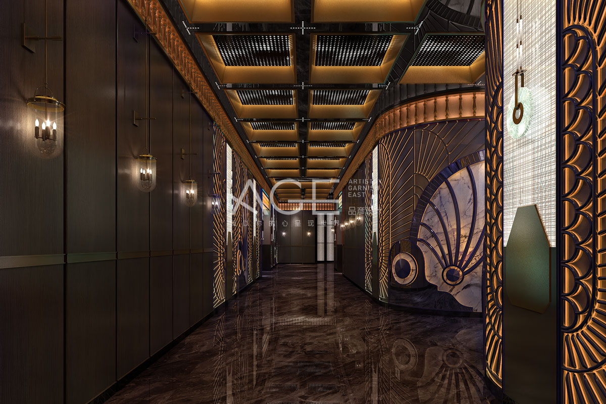 走廊,整體裝飾延續(xù)線條勾勒出的立體美,燈光主色調(diào)是金色,輔助色是灰,彰顯出的輕奢氣息,用線條讓整體空間立體感十足,仿佛讓人置身于神秘的高雅畫境之中。