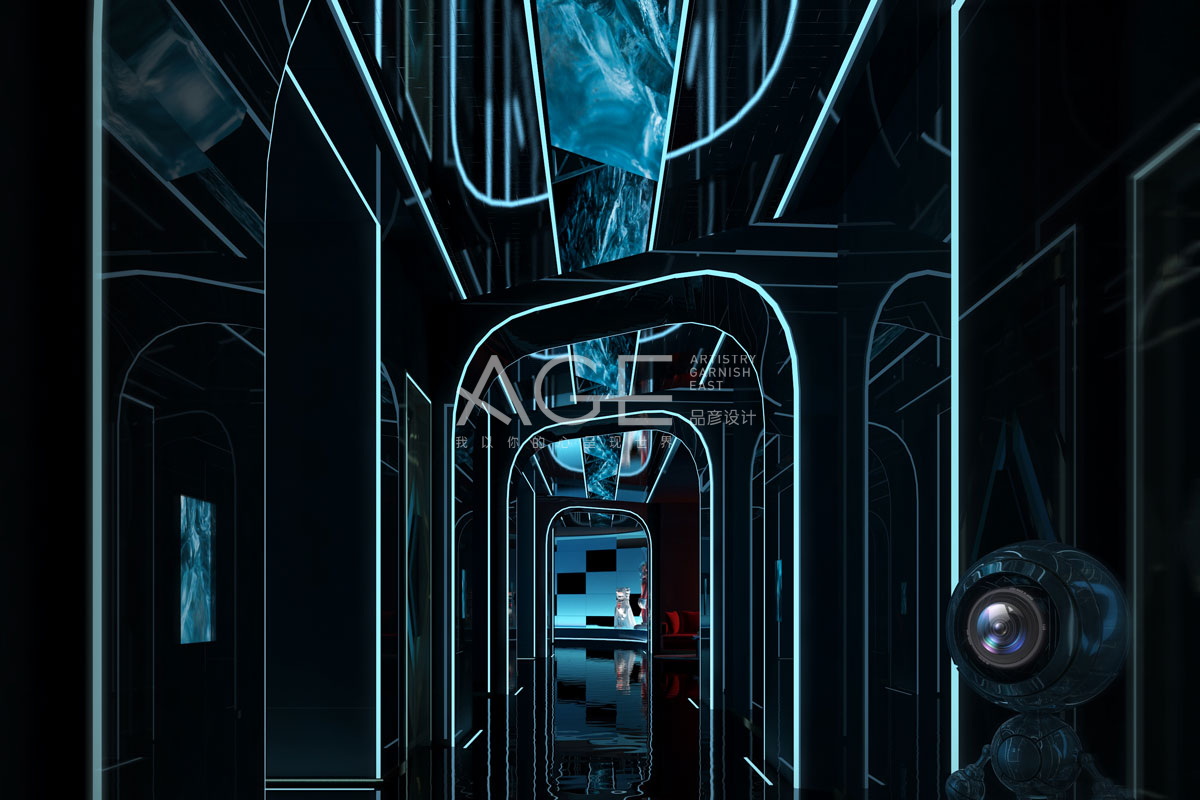連廊,延續(xù)整體設(shè)計(jì)風(fēng)格,線條勾勒出方形或者橢圓形,襯托出立體的效果。燈效1,主色調(diào)為孔雀藍(lán)配上金色,兩者色調(diào)用輔助色灰襯托出輕奢的優(yōu)雅,形成一種獨(dú)特的空間效果,極致的彰顯空間氣質(zhì)和張力。燈效2整體色調(diào)為金色加灰色,搭配勾勒出的線條裝飾,形成立體層次感,盡顯高雅的神秘。