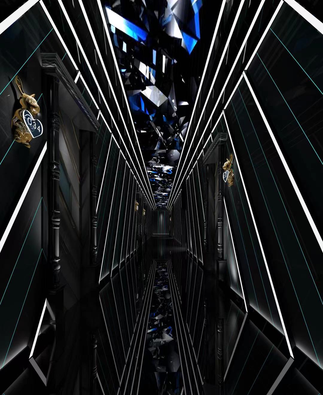 設計師在走道兩側墻壁和地面均采用純黑色板材,搭配有序布置的白色燈條,將整個走道空間塑造得深邃幽靜。同時,在墻壁燈條布置方面,設計師采用斜條紋設計,讓其搭配頂端貫通前后的筆直白色燈帶,在視覺上讓墻壁的白色燈條有了頂天立地般的挑高之感。吊頂中央的連貫區域,設計師采用有破碎美感的閃爍著神秘耀眼光芒的類藍寶石裝飾,讓這條藍寶石之路就像是鋪展在走道之上的瑰麗天路,神秘深幽。派對房門設計依舊采用具有中式特色的門柱門楣,增加整體設計厚重感,幾者相互搭配碰撞,共同鑄造了一條瑰麗磅礴的幽雅走道。