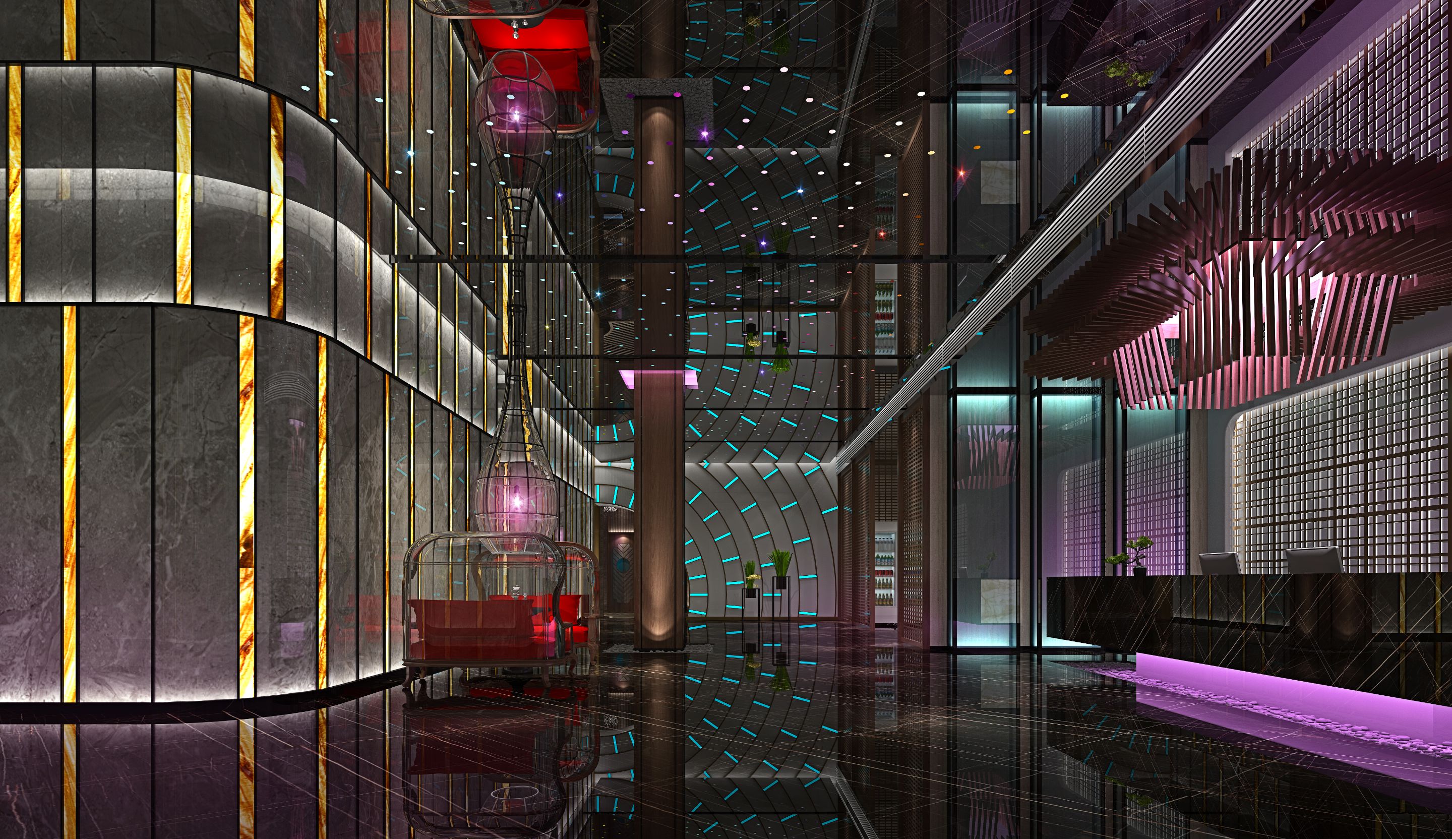 大廳設計,設計師采用大面積中式設計特有元素:木質格柵、斗拱、藻井等來體現會所的民族特色。在大廳的顯眼位置,設計師設計了一處西方中世紀馬車外形的沙發候客區,亮眼的艷紅色沙發搭配上散發著粉紫色光芒的中世紀燈籠,讓候客區成為整個大廳的耀眼存在。吊頂設計采用平滑黑色建材,點綴數量繁多的星燈,在五彩斑斕的星燈和大廳繽紛燈光的映襯下,吊頂區域就好似一面散發著璀璨星光的夜空。大廳通過玫紅、淡紫、青藍,亮黃等等不同燈光和裝修色澤,以及設計元素的搭配,展現了整體裝修設計的隨性不羈、多元素碰撞,尤為貼合貴州地區熱情強烈的多民族文化特性。