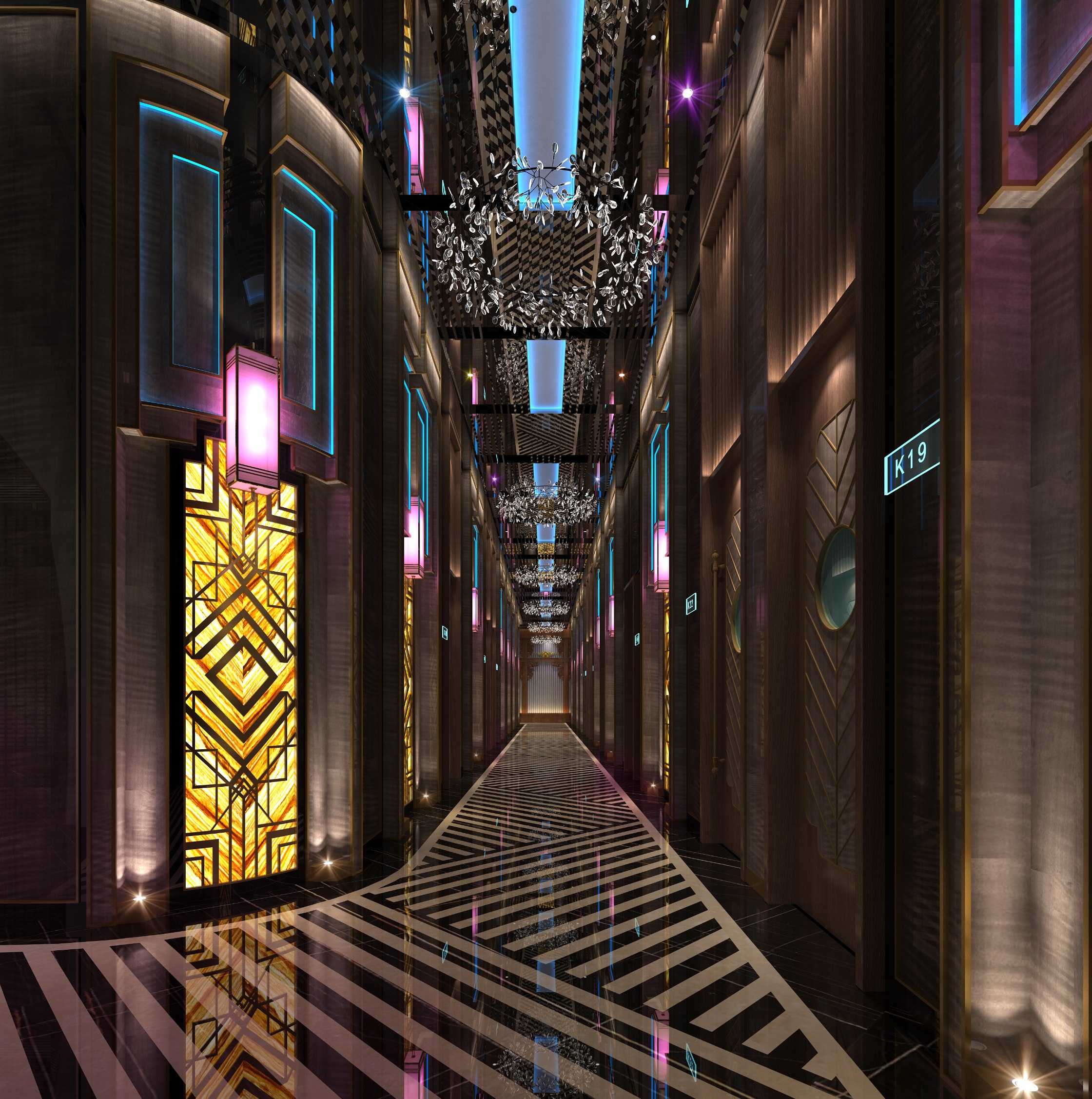 走道設計延續用艷麗色彩反映熱情奔放的地區特色的設計理念,用橘黃、亮紫、青藍等幾種色澤的燈光配合吊頂反射的整體光效,將整條走道氤氳在五彩斑斕的霓虹內,給人以熱情繁華之感。同時走道的裝修設計也極為考究,散發著橘黃色的燈牌表面采用中式園林建筑中特有的窗欞設計,燈牌上部分設計則有幾分次序、規律、統一的意式建筑風格韻味。吊飾設計采用草環造型,讓整體設計多了幾分貼近自然之感,地面鋪滿的黑白交錯的斜條紋光滑地磚,在簡約質樸的同時蘊藏著一抹遠古圖騰意味。