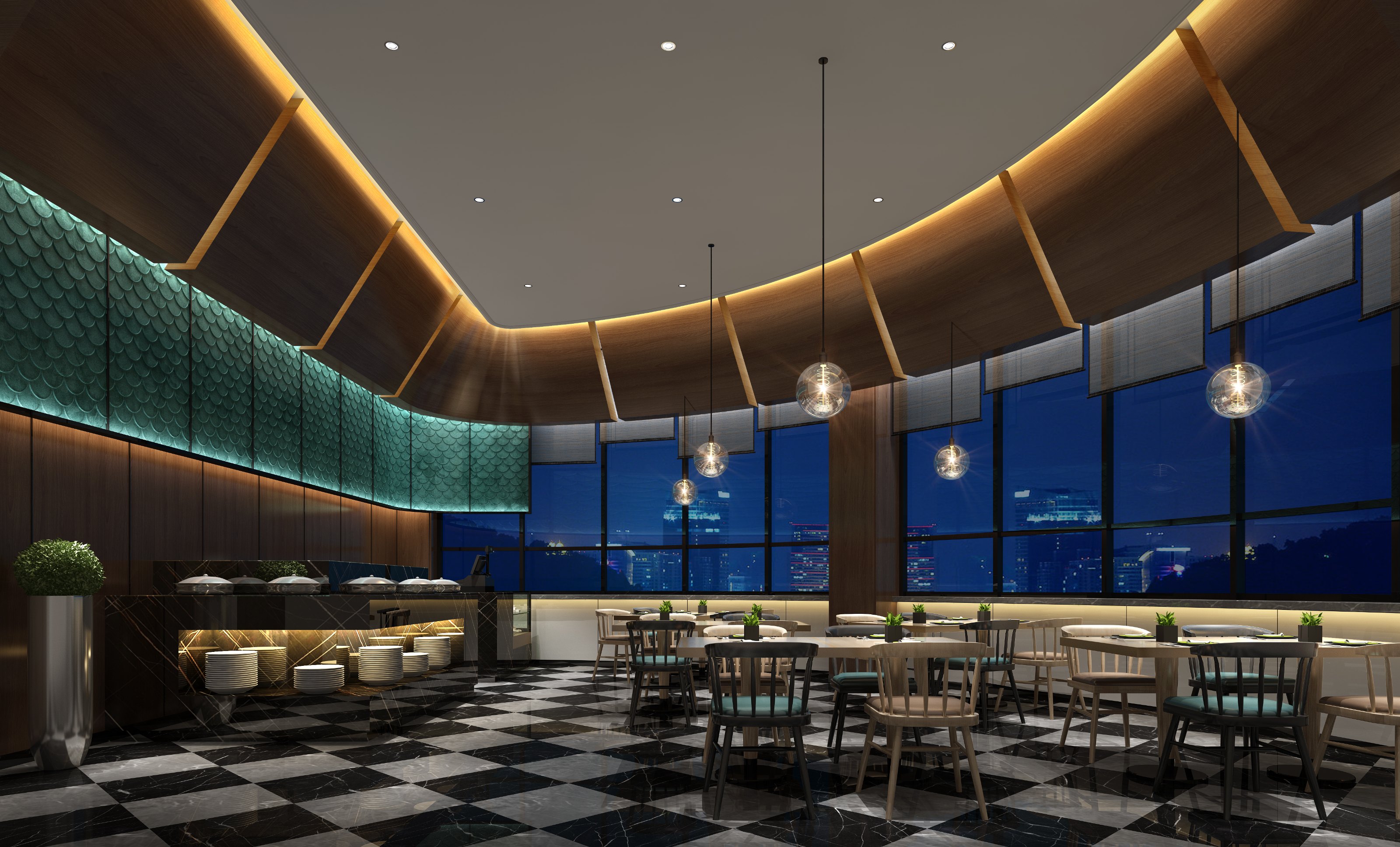 自助餐區的主體設計,包括整體空間、吊頂及一旁窗戶,皆是采用了圓角設計。其搭配點綴的細節裝飾用到中式傳統元素,有充滿古韻的中式紗布窗簾,有像龍鱗般有序排列的綠瓦裝飾。設計師采用地中海建筑風格搭配中式傳統設計風格,為消費者呈現一個閑適浪漫寧靜的用餐空間。
