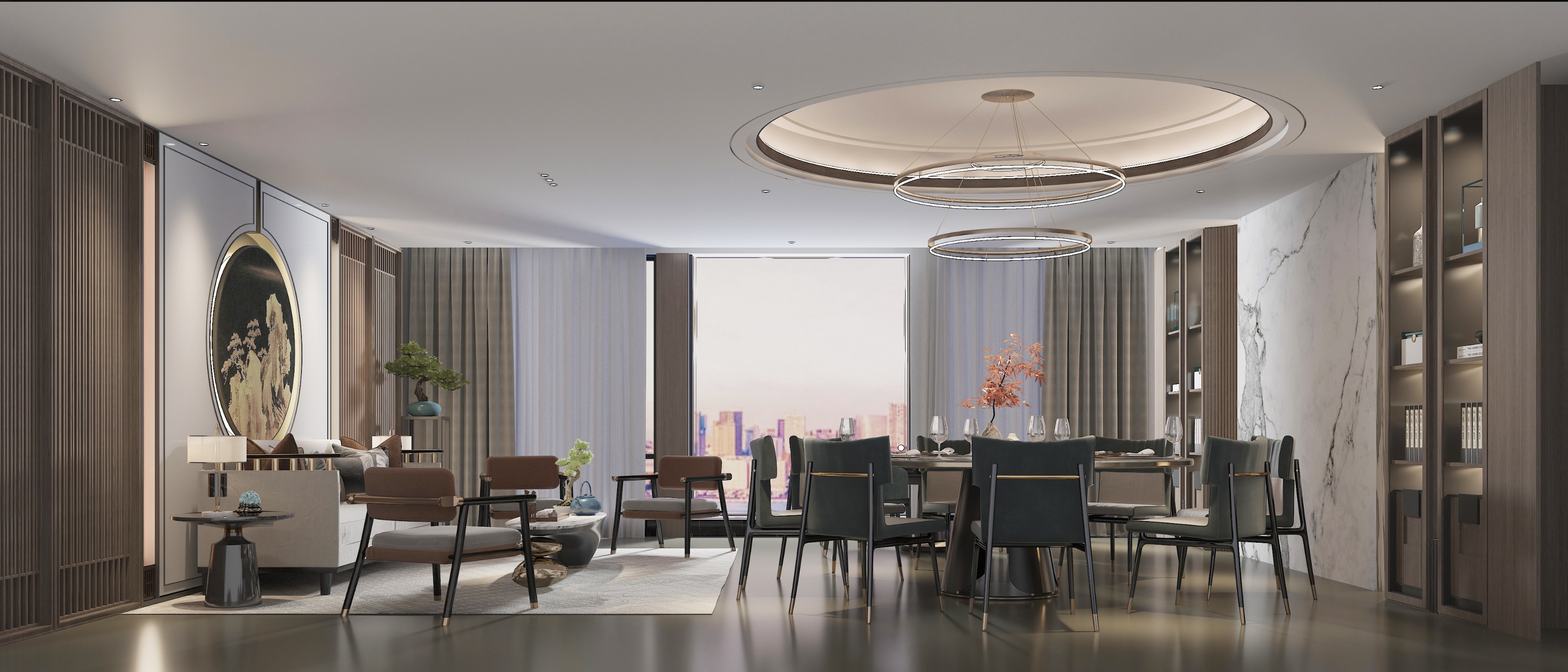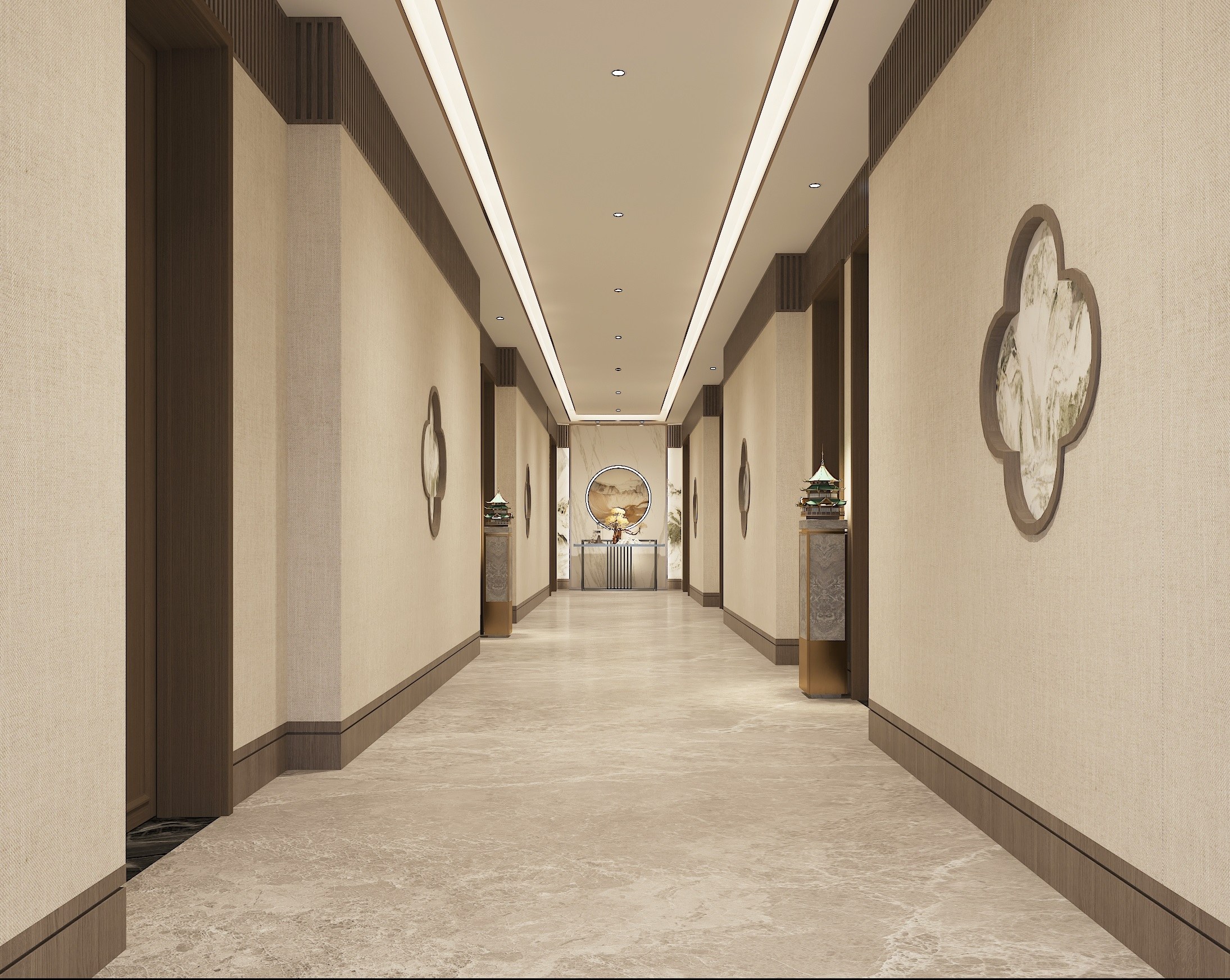 走廊過道設計以寬闊平整彰顯大氣,整體裝修色調以米白色搭配木色營造溫馨淡雅氛圍。走道兩側墻面裝飾,設計師采用梅花漏窗這一蘇式園林建筑中獨具韻味的設計元素,結合水墨山水畫卷和精致小巧的微縮八角亭,將開闊寧靜和古韻綿長完美帶入到走廊過道的整體設計中。