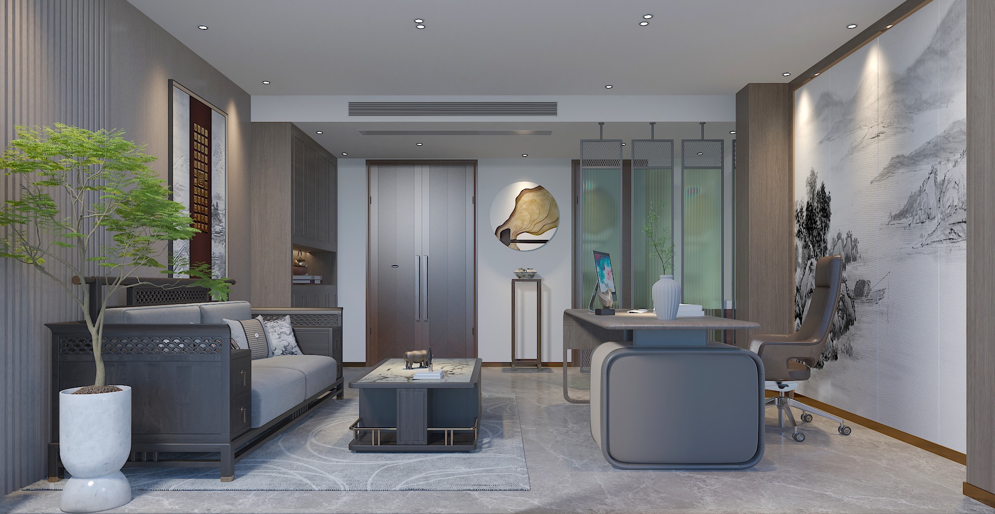 辦公室設計為貼近現代辦公所需,其裝修設計注定要兼具辦公實用性外,還應該與茶室整體裝修氛圍相一致。因此設計師在茶室辦公室的設計上,采用了相對簡約和色系一致的現代辦公用品,讓其融入整體由中式傳統建筑元素組成的淡雅古韻的設計環境中,不顯突兀。