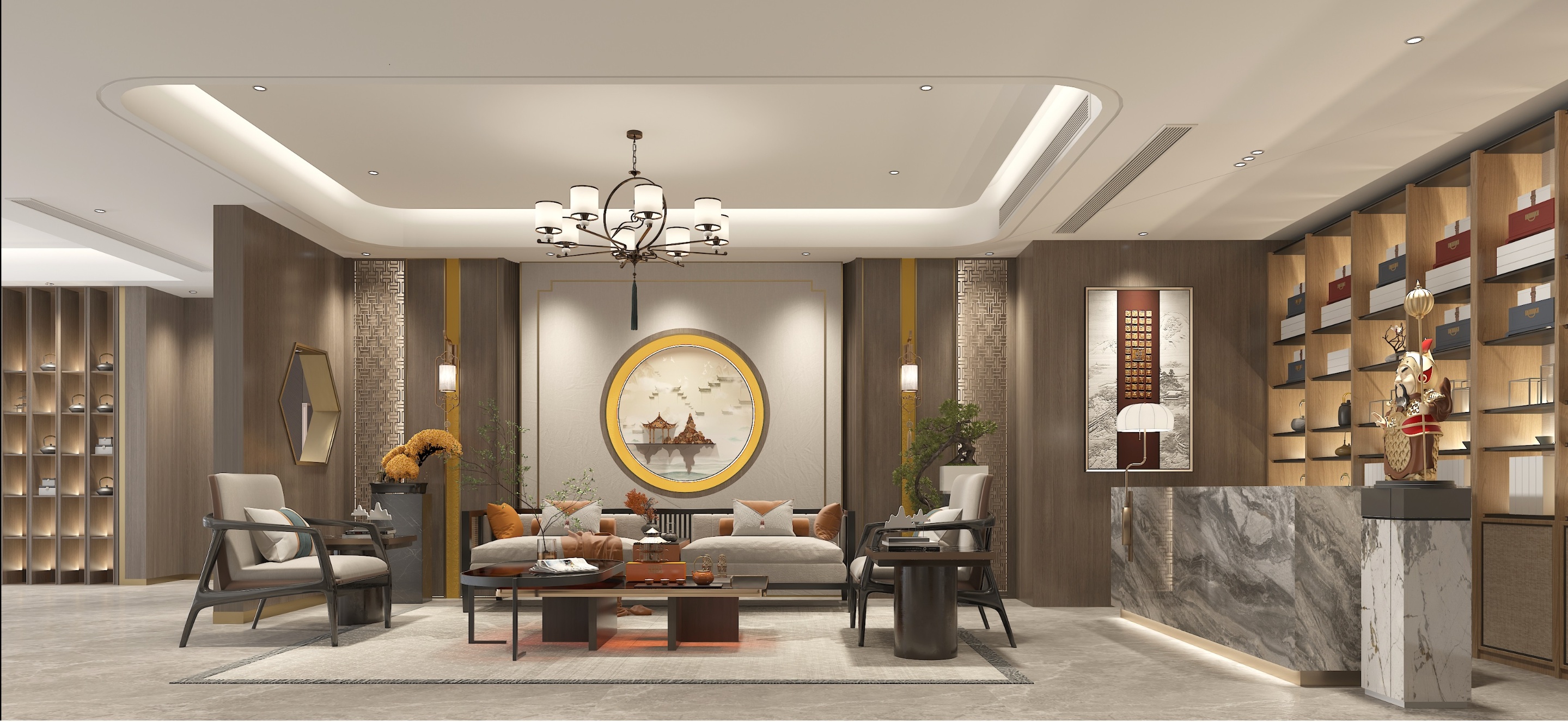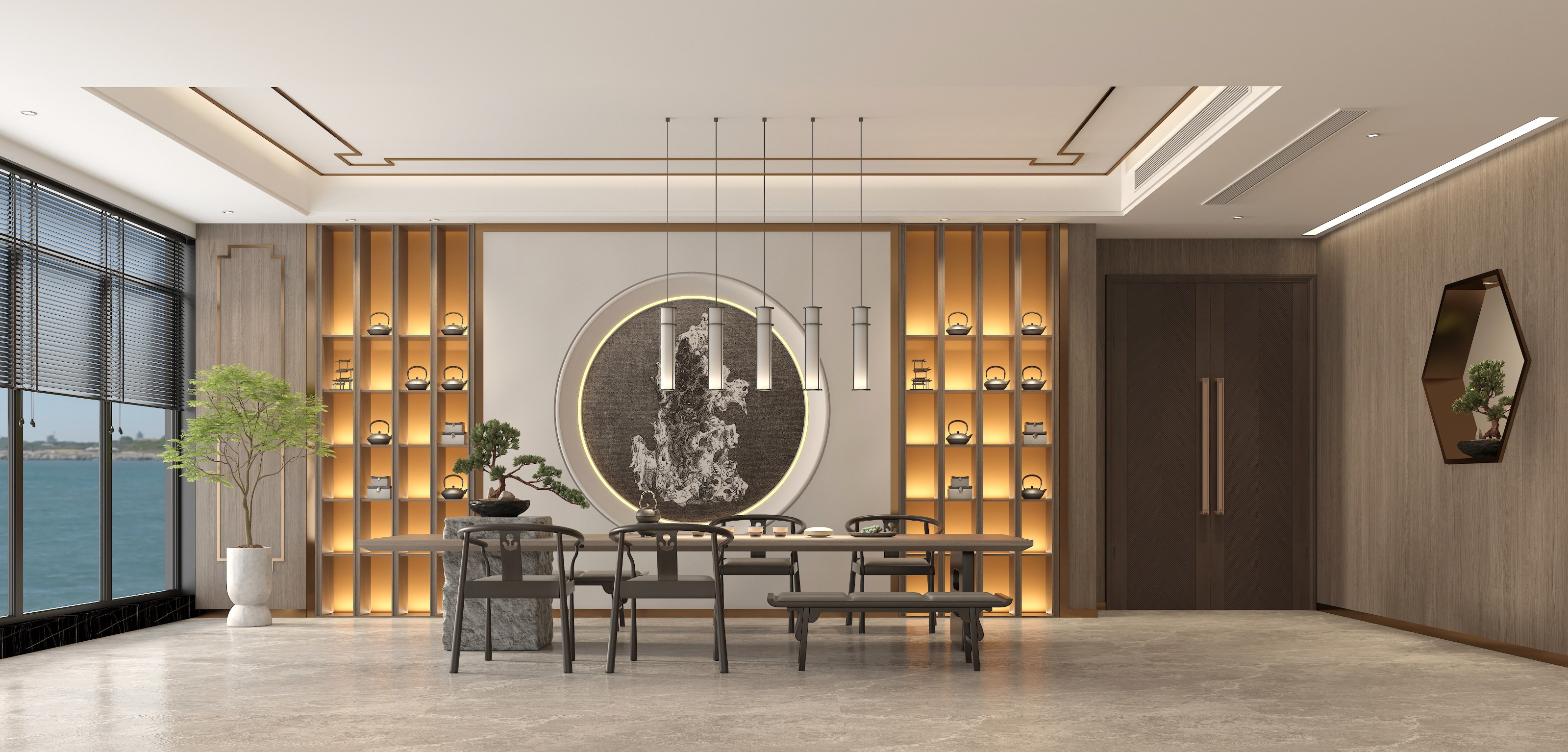 茶區作為整個茶室最為重要的功能分區,其裝修設計必須迎合消費者的心境所需。除了必要的開闊視野和寬敞的物理空間讓消費者從身體觀感上感到順暢外,還需要用充滿意蘊的設計讓消費者的精神靈魂得到升華。在這方面,設計師因地制宜,用多面落地窗將室外的風景投射到室內,提升視野開闊感和靈魂延伸感。在室內裝修設計上,設計師用山水樹木擺件烘托自然氛圍,用自然寧靜讓消費者心神平和。