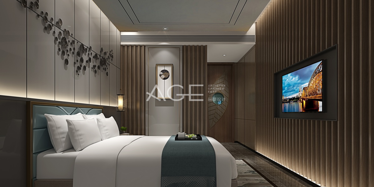 按摩房整體設計空間表達含蓄,達到以簡勝繁的效果,又有溫馨和舒適之感,落地大窗戶設計簡潔大方,滿屋的木質地板又給人家的感覺,帶有電視背景墻與地板色調相似,并且形成呼應的感覺,而對面大床后的墻體又與大方形套小方形的天花板相呼應,用層次感提升整體設計的簡潔明快,又溫暖舒適。