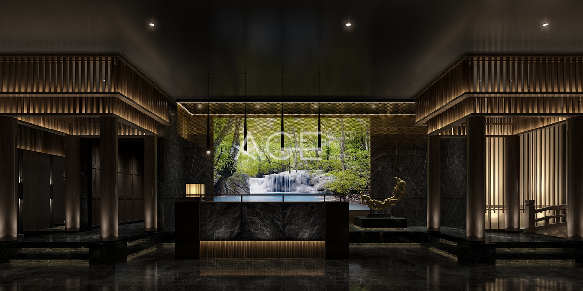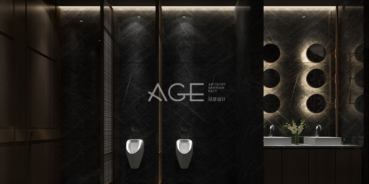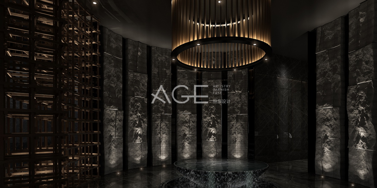 公衛前廳整體設計與燈光交匯,以黑灰為基調,更顯得華貴與神秘,加入圓的設計元素,提升高檔感,圓形環狀墻體線條讓凹凸質感的墻面帶出層次感,條紋的大理石地板中間設計成大圓形石凳與頂部圓形吊燈相呼應,用燈光照應出一種神秘感。