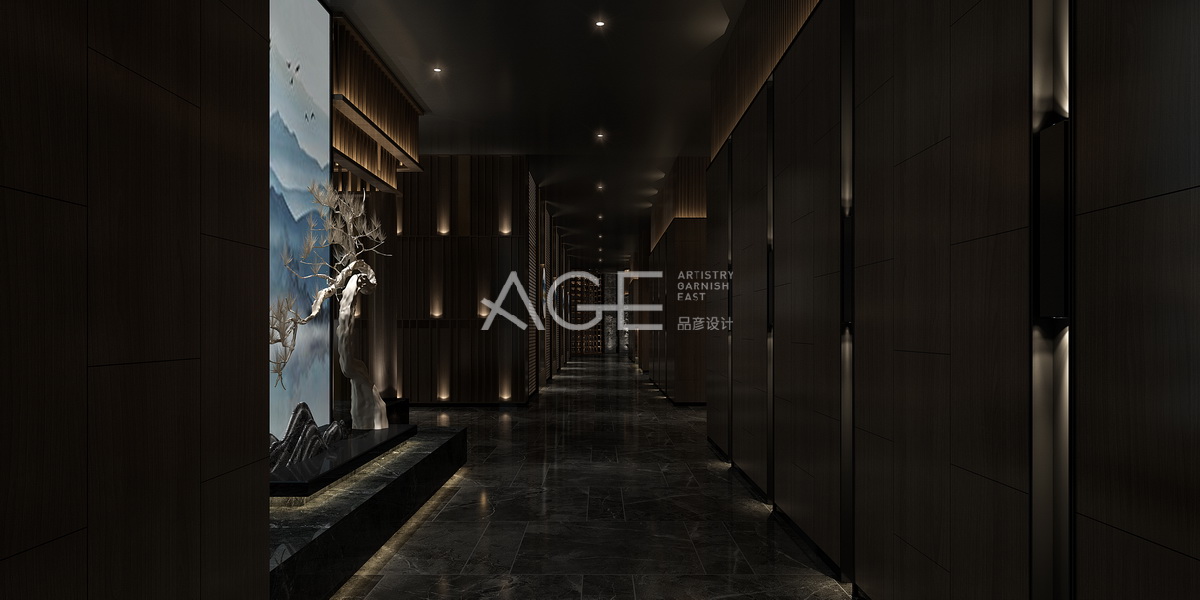 走廊色彩使用上更為清新淡雅,給人一種自由輕松之感。一側墻體整體設計立體感十足,用燈光細化出層次感,而對面一側墻體在設計中加了一處明亮背景的景觀欣賞,走廊地板采用的是錯落有序的塊狀大理石地面,放眼望去整體走廊是一派高貴之氣。