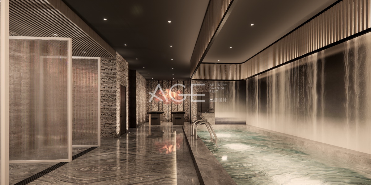 公共浴池設計的金碧輝煌,整體線條設計明朗,錯落有序,分隔出三個區域。角落更衣墻體裝飾為有石頭質感的土色墻面,通道設計是水波紋的大理石地面,并與單色頂部形成相呼應;通道一側是一個大大碧綠泳池,與水波紋大理石又形成一動一靜的錯落感,而通道另一側是一間間淋浴間。從整體設計來看,大氣輝煌一目了然,仿佛進入水霧世界。